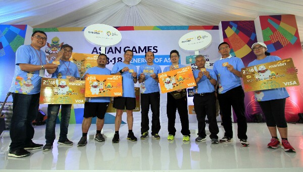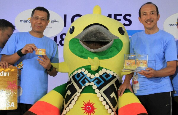 Direktur Retail Banking Bank Mandiri Tardi menyerahkan plakat berisi Mandiri Kartu Debit dan Kartu Kredit edisi Asian Games 2018 kepada Sekjen Indonesia Asian Games Organizing Committee (INASGOC) Eris Herryanto di sela-sela perhelatan Mandiri Jakarta Marathon 2017 di Silang Monas Jakarta, Minggu (29/10). Bank Mandiri meluncurkan kartu debit dan kartu kredit desain khusus Asian Games 2018 untuk menggelorakan semangat masyarakat dalam mensukseskan perhelatan akbar Asian Games 2018 yang akan berlangsung di Jakarta dan Palembang. Hingga September 2017, kartu debit yang telah diterbitkan Bank Mandiri sebanyak masing-masing 16,2 juta kartu  dengan frekuensi transaksi mencapai lebih dari 71 Juta transaksi senilai lebih dari Rp49 triliun. (*)