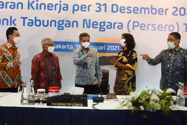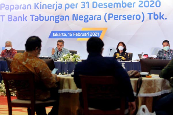 Plt. Direktur Utama PT Bank Tabungan Negara (Persero) Tbk. Nixon LP Napitupulu (tengah) didampingi Jajaran Direksi Bank BTN Setiyo Wibowo, Jasmin, Elisabeth Novie Riswanti, dan Hirwandi Gafar saat laporan keuangan perseroan di tengah Media Brief Paparan Kinerja Kuartal IV/2020 di Jakarta, Senin, 15 Februari 2021. Menutup tahun 2020, PT Bank Tabungan Negara (Persero) Tbk. mencatatkan perolehan laba bersih yang meroket 665,71% secara tahunan (year-on-year/yoy). Di tengah tekanan pandemi, Bank BTN sukses meraih laba bersih senilai Rp1,60 triliun pada kuartal IV/2020, melambung tinggi dari posisi Rp209 miliar di periode yang sama tahun sebelumnya. Lompatan laba bersih tersebut ditopang oleh lima strategi utama perseroan yang digelar sepanjang 2020. Selain itu, sektor perumahan juga menjadi penopang suburnya pundi-pundi laba BTN karena bergerak positif di tengah koreksi pertumbuhan ekonomi akibat pandemi.
