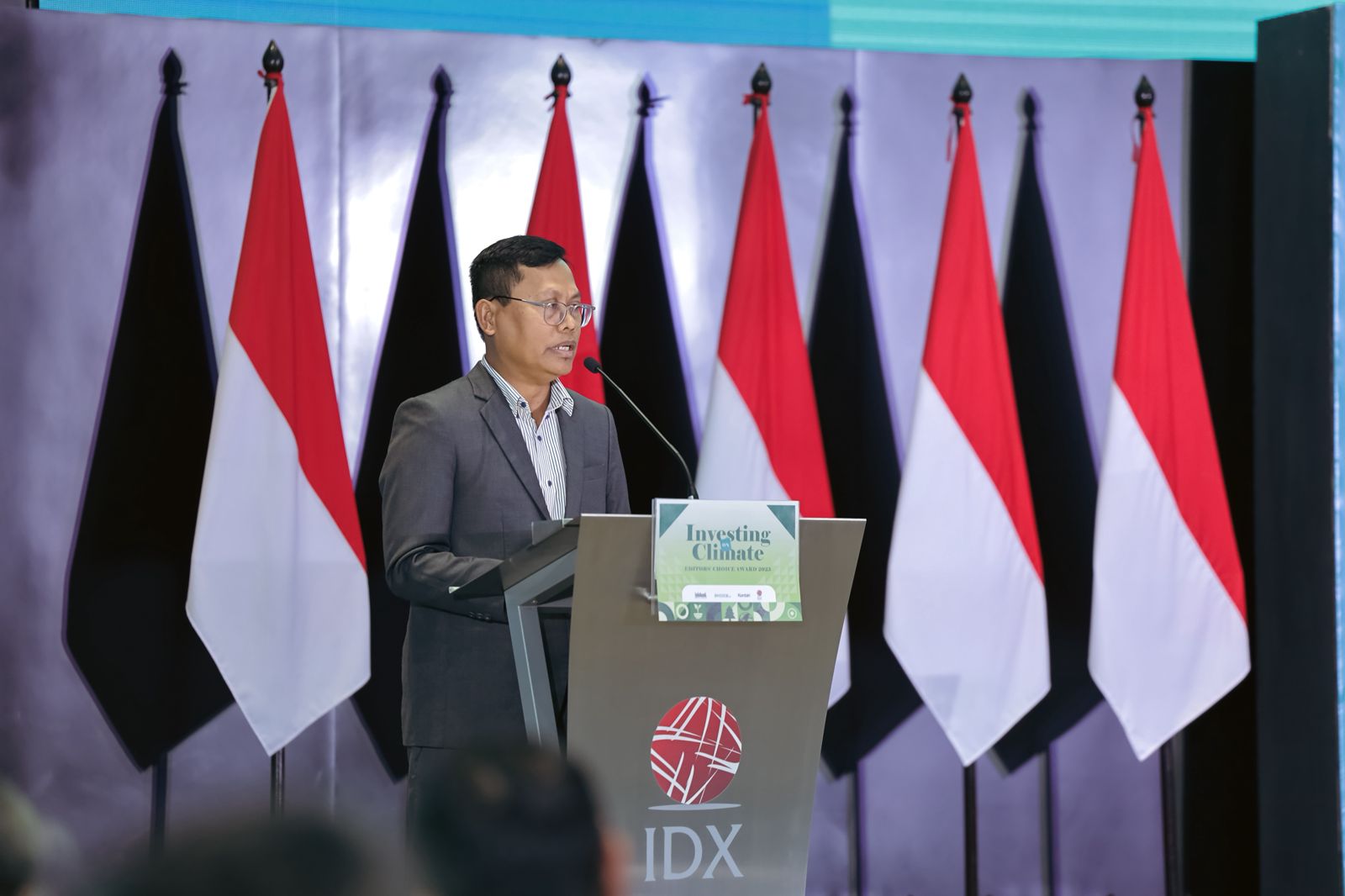 Managing Director Investing on Climate, Umar Idris, saat menjadi pembicara di ajang Investing on Climate by Editors’ Choice Award 2025, di Main Hall Bursa Efek Indonesia (BEI), Jakarta Selatan, Jumat (5/12). (Foto: M. Ibrahim)