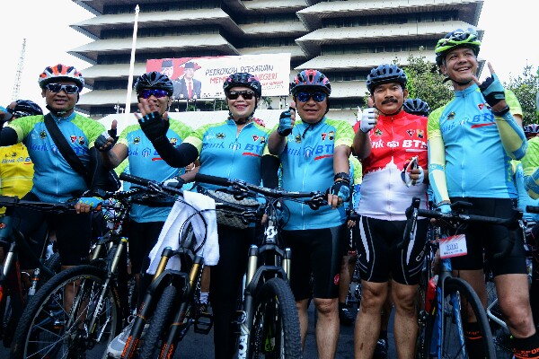 Direktur Utama PT Bank Tabungan Negara (Persero) Tbk, Maryono bersepeda bersama Gubernur Jawa Tengah Ganjar Pranowo di ajang BTN Tour de Borobudur XVII di Semarang, Jawa Tengah, Sabtu (11/11). Bank BTN kembali mendukung  ajang olahraga sepeda yang dipadu pariwisata sebagai bentuk kontribusi terhadap pengembangan potensi wisata daerah. Dalam event yang berlangsung dari tanggal 11-12 November ini BTN juga memberikan sejumlah bantuan, di antaranya 10.000 benih ikan dan 1.000 pohon di kawasan wisata Bendungan Jatibarang. Selain itu,  Bank BTN juga memberikan dana sosial senilai ratusan juta dari aksi sosial para peserta BTN Tour de Borobudur XVII. (*)