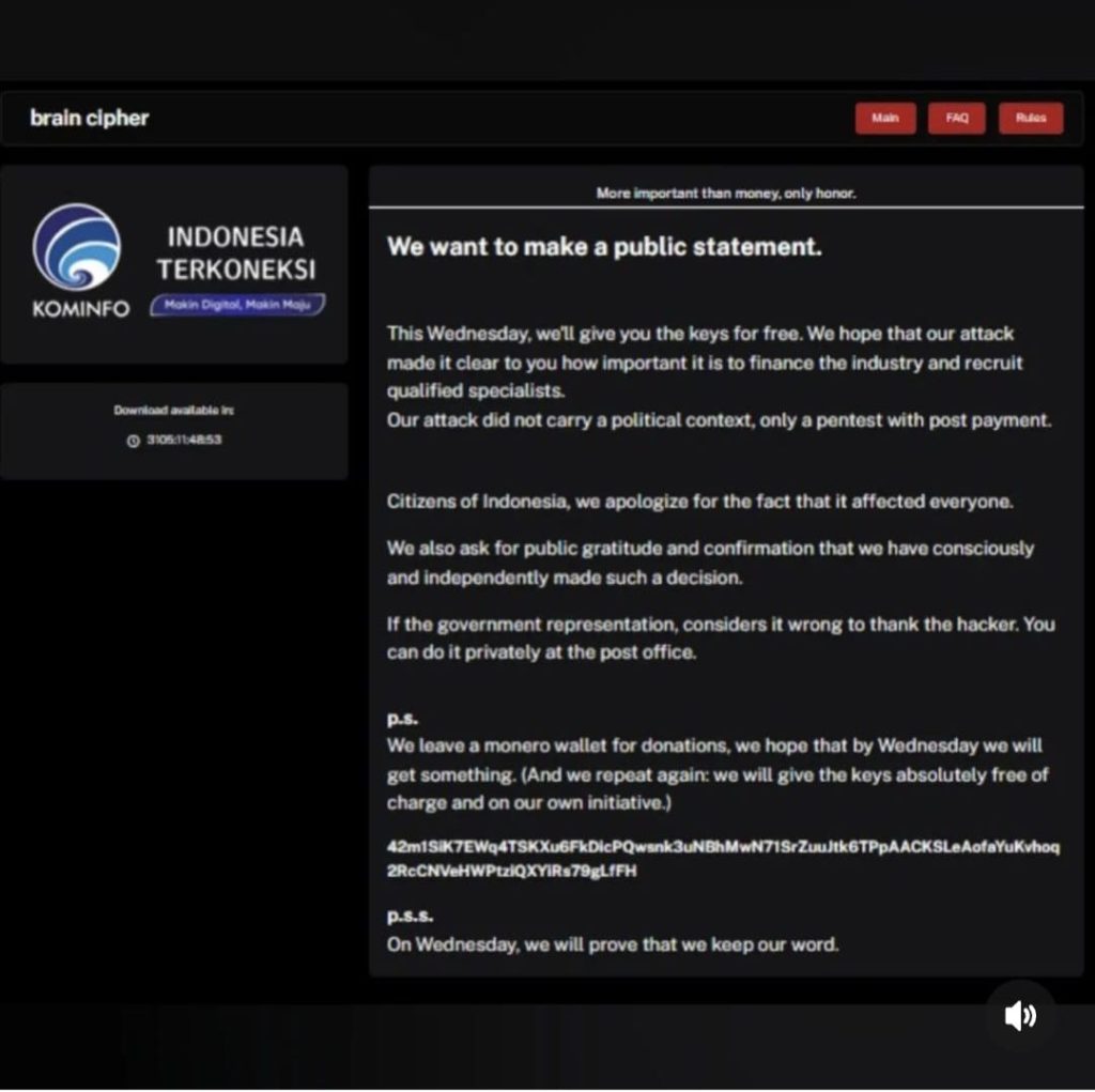 Jakarta – Kelompok peretas bernama Brand Chiper yang menyerang Pusat Data Nasional Sementara (PDNS) milik Kementerian Komunikasi dan Infomatika (Kemenkominfo) membuat pengumuman permintaan maaf kepada pemerintah Indonesia lantaran atas kegaduan yang sudah mereka buat.