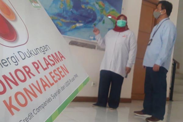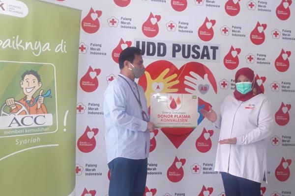 Kepala Unit Usaha Syariah Astra Credit Companies (ACC), Wisnu Wardhana (kiri) menyerahkan secara simbolis bantuan donor plasma kepada Kepala Unit Donor Darah PMI Ria Syafitri (kanan) di Jakarta, Kamis, 4 Februari 2021. Astra Credit Companies (ACC), perusahaan pembiayaan pertama Astra, melakukan sinergi dengan Palang Merah Indonesia (PMI) Unit Donor Darah (UDD) Pusat dalam hal dukungan Donor Plasma Konvalesen. Pada sinergi tahap pertama ini ACC memberikan dukungan berupa 250 paket suplemen dan makanan untuk meningkatkan daya tahan tubuh kepada pendonor plasma konvalesen dan juga 750 paket new normal kit untuk pendonor darah PMI.