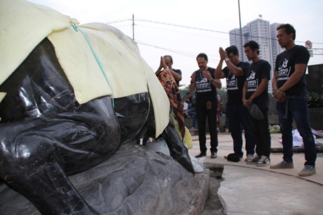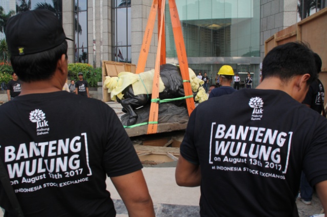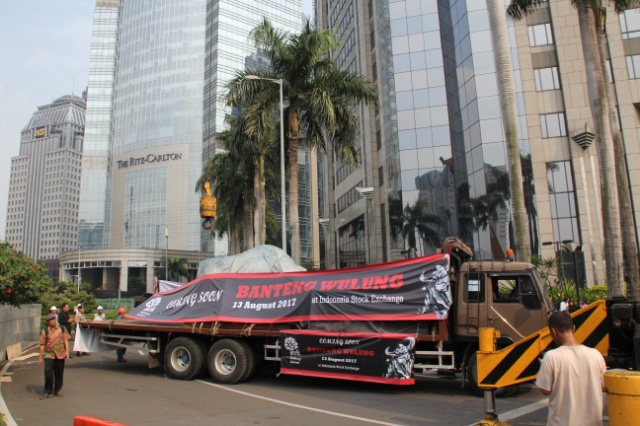 Direktur Utama Bursa Efek Indonesia Tito Sulistio dan Pemahat Bali Made Budiasa menyaksikan pemasangan Patung Banteng Wulung di Halaman Gedung BEI Jakarta,Kamis 27 Juli 2017.Patung Banteng Wulung seberat kurang lebih 7 ton terbuat dari fosil kayu ini langsung dibawa dari Bali akan menghiasi halaman gedung bursa yang nantinya akan diresmikan oleh Presiden RI Joko widodo pada tanggal 13 Agustus 2017.(Budi Urtadi)
