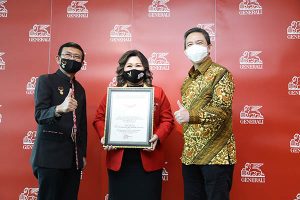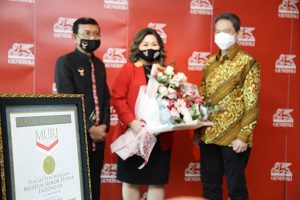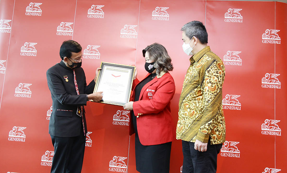 Chief Agency Officer Generali Indonesia Sastradinata (kanan) dan Agen Generali Indonesia Thio Siu Lie (tengah) menerima penghargaan dari Senior Manager Museum Rekor-Dunia Indonesia (MURI) Jusuf Ngadri di Jakarta, Rabu, 22 Desember 2021. Thio Siu Lie berhasil mencetak Rekor MURI sebagai Agen yang meraih Top of The Table MDRT secara Berurutan Terlama. Rekor ini berhasil ia pecahkan karena prestasinya yang bisa mendapatkan gelar Top of The Table (TOT) dari Million Dollar Round Table selama 5 tahun berturut-turut sejak tahun 2017 hingga 2021.