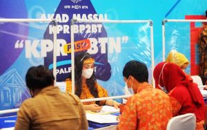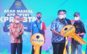 Direktur Consumer and Commercial Lending Bank BTN Hirwandi Gafar berbincang dengan Pj Sekda Sumatera Selatan Supriono, Dirjen Pembiayaan Infrastruktur Kementerian PUPR Herry Trisaputra Zuna dan Komisioner BP Tapera Adi Setianto dalam acara Akad Kredit Massal KPR BP2BT di Perumahan Dream Land II, Kabupaten Banyuasin, Palembang, Sumatera Selatan, Sabtu 20 November 2021. Bank BTN menggelar Akad Massal KPR BP2BT yang dilakukan secara serentak di Indonesia dengan target 11 ribu unit rumah untuk menyukseskan program Pembangunan Sejuta Rumah. Acara ini merupakan rangkaian kegiatan HUT KPR BTN ke-45 yang diperingati setiap tanggal 10 Desember.