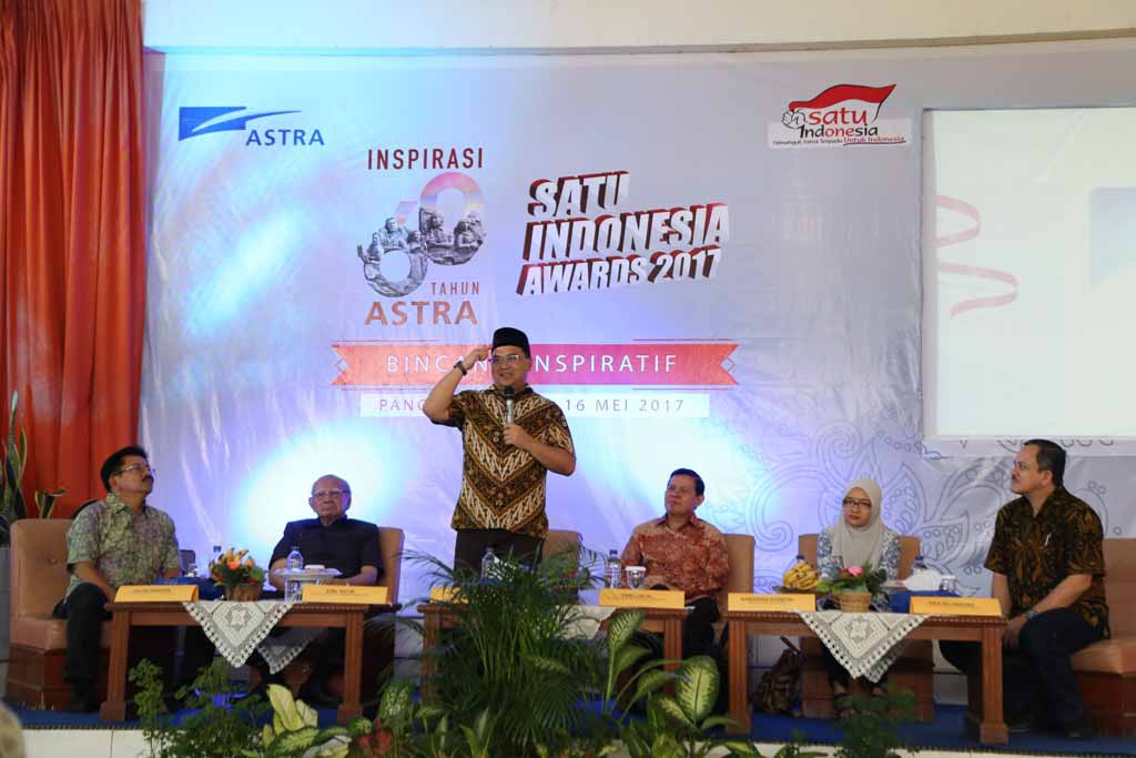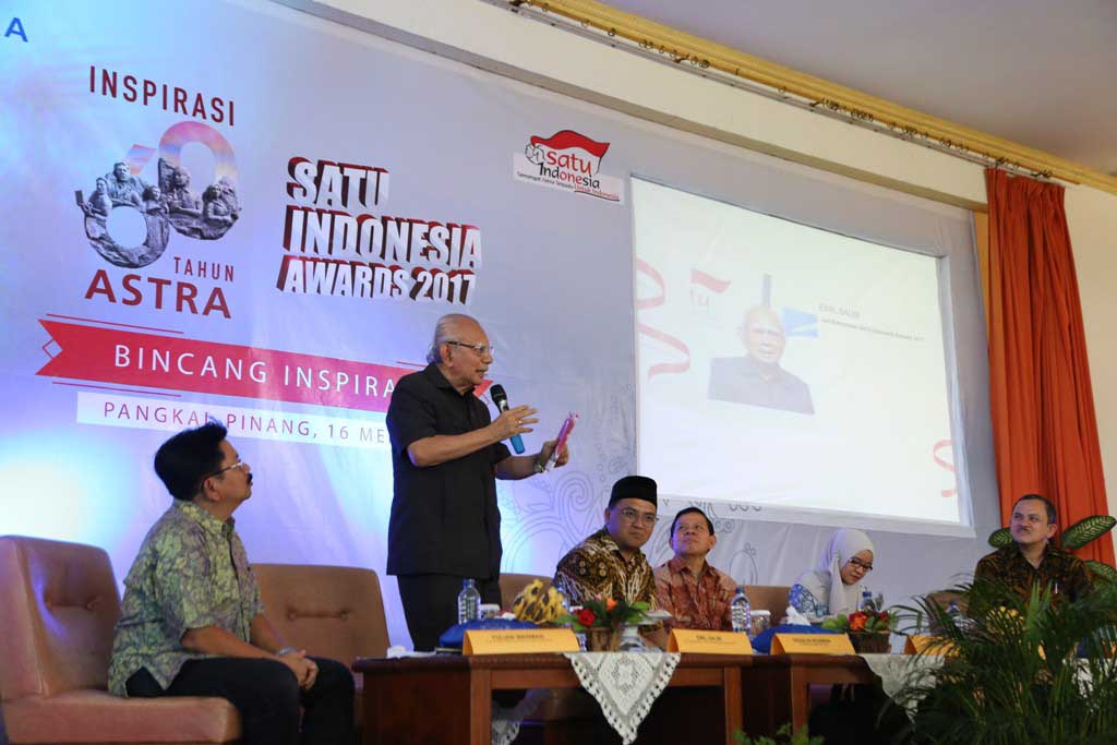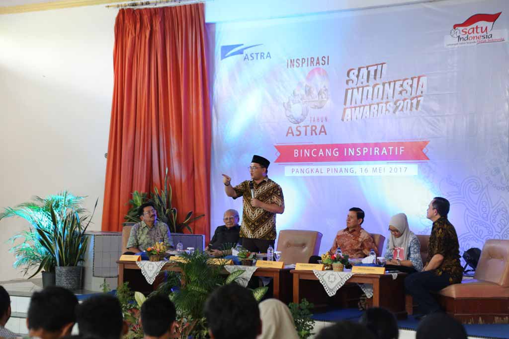 Gubernur Kepulauan Bangka Belitung Erzaldi Rosman (ketiga kiri) yang baru menjabat selama dua hari berbincang bersama Wakil Menteri Pendidikan Nasional RI 2010-2012 Fasli Jalal (ketiga kanan), Dosen Ilmu Lingkungan Pasca Sarjana Universitas Indonesia Emil Salim (kedua kiri) yang keduanya merupakan Dewan Juri SATU Indonesia Awards, Penerima apresiasi SATU Indonesia Awards 2013 Hardinisa Syamitri (kedua kanan), Head of Environment & Social Responsibility PT Astra International Tbk Riza Deliansyah (kanan) serta Head of Public Relations PT Astra International Tbk Yulian Warman (kiri) pada acara Bincang Inspiratif SATU Indonesia Awards 2017 di Pulau Bangka Provinsi Kepulauan Bangka Belitung,Selasa 16 Mei 2017.PT Astra International Tbk melanjutkan pencarian laskar pemuda-pemudi yang sudah berkarya bagi sesama, setelah sebelumnya mengunjungi Tarakan (Kalimantan Utara), Ternate (Maluku Utara) dan Palu (Sulawesi Tengah),“Negeri Laskar Pelangi”, Babel juga disebut sebagai provinsi yang kaya akan hasil bumi berupa timah. Selain memendam timah, Astra meyakini Babel juga memendam banyak prestasi dan pencapaian yang membanggakan dari pemuda-pemudinya.Ini dipilih sebagai destinasi terakhir roadshow Semangat Astra Terpadu Untuk (SATU) Indonesia Awards 2017.(*)