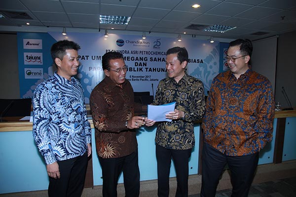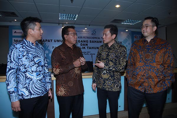 Presiden Direktur PT Chandra Asri Petrochemical Tbk (CAP) Erwin Ciputra (kedua kanan), berbincang bersama Presiden Komisaris Djoko Suyanto (kedua kiri), Komisaris Agus Salim Pangestu (kanan), dan Wakil Presiden Direktur Kulachet Dharachandra (kiri) seusai Rapat Umum Pemegang Saham Luar Biasa di Jakarta, Senin 6 November 2017. Pemegang saham telah menyetujui pemecahan nilai nominal (stock split) atas saham perseroan dengan rasio 1:5 guna memperbesar basis pemegang saham dari investor perorangan dan institusi serta mendorong saham TPIA semakin likuid di bursa. (*)