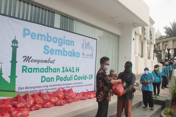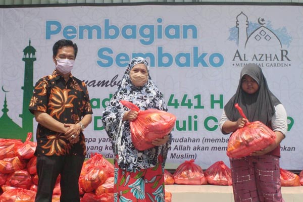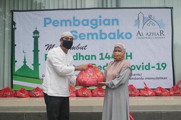 Direktur Utama Al Azhar Memorial Garden, Nugroho Adiwiwoho (kiri) secara simbolis menyerahkan secara langsung kepada warga bingkisan sembako menyambut Ramadhan 1441 H dan Aksi Peduli Covid-19 di area Pemakaman Al Azhar Memorial Garden, Karawang, Jawa Barat, Kamis 22 April 2020. Selain kepada warga sekitar, Al Azhar Memorial Garden memberikan paket sembako serupa kepada Satgas Covid-19 Telukjambe Karawang Timur sebanyak 100 paket beras. Pembagian dilakukan dengan prosedur ketat mengikuti aturan pemerintah dalam pencegahan penularan Covid-19 yaitu wajib memakai masker, menggunakan hand sanitizer pada saat masuk acara, physical distance 1 meter dan pengukuran suhu badan di gerbang Al Azhar Memorial Garden.