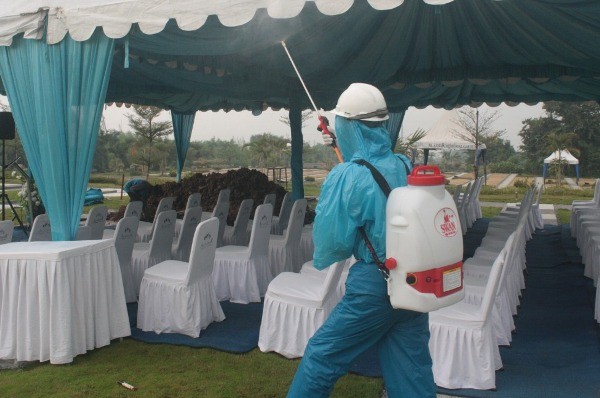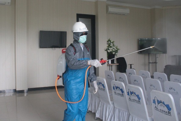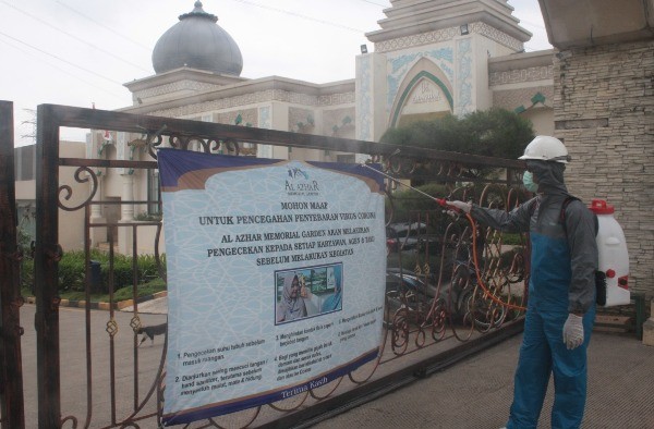 Seorang petugas tengah melakukan penyemprotan cairan disinfektan di Taman Pemakaman Muslim Al Azhar Memorial Garden, yang berlokasi di Teluk Jambe Timur Karawang, jalan tol Jakarta-Cikampek KM 52, Karawang, Jawa Barat, Selasa, 24 Maret 2020. Penyemprotan cairan disinfektan dilakukan untuk mencegah penyebaran virus corona Covid-19. Penyemprotan dilakukan setiap hari sesuai anjuran pemerintah untuk mencegah penyebaran wabah virus Corona. Selain sterilisasi dengan cairan disinfektan, pihaknya telah membuat Standard Operation Procedure (SOP) untuk karyawan, agen, tamu dan peziarah. SOP itu berupa pemeriksaan suhu badan sebelum memasuki area komplek pemakaman, menyediakan pembersih tangan (hand sanitizer) di setiap ruangan dan alat pelindung diri (APD) lainnya. Penyediaan alat-alat dan fasilitas tersebut, merupakan bagian dari tanggungjawab pengelola untuk mencegah penyebaran virus.
