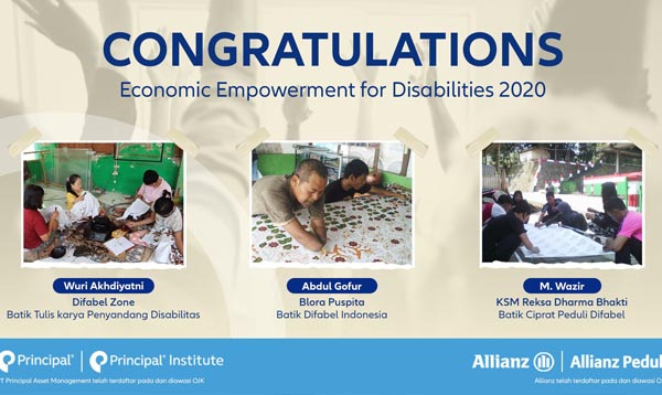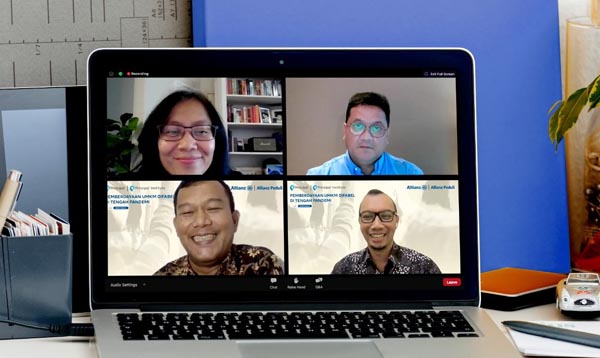 Deputi Bidang Produksi dan Pemasaran Kementerian Koperasi dan UMKM, Victoria br. Simanungkalit (kanan atas), Ketua Yayasan Allianz Peduli, Ni Made Daryanti (tangah atas) dan Chief Executive Officer, Principal Asset Management Agung Budiono(kiri atas) dalam Webinar Pemberdayaan UMKM Difabel di Tengah Pandemi di Jakarta Rabu 11 November 2020. Allianz Indonesia melalui Yayasan Allianz Peduli, bersama Principal Asset Management menggelar acara puncak Kompetisi EMPOWERED 3.0 secara virtual dengan pemberian dana pengembangan usaha masing-masing 50 juta Rupiah, bagi tiga UMKM difabel yang memiliki rencana usaha terbaik. Kompetisi EMPOWERED 3.0 sendiri adalah program pendampingan dan pengembangan usaha untuk pemberdayaan masyarakat difabel agar dapat mandiri, produktif dan bisa memiliki pendapatan yang layak, sesuai dengan skill dan kemampuan yang dimiliki. Melalui kompetisi ini, pelaku UMKM penyandang difabilitas, mendapatkan pendampingan dan pengembangan usaha dari tim mentor yang berkompetensi dari Allianz Indonesia dan Principal Asset Management.
