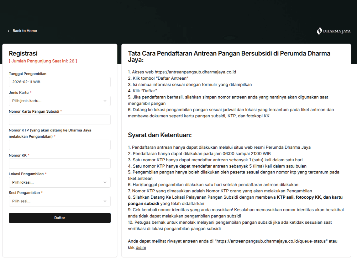 Pendaftaran antrean KJP melalui Perumda Dharma Jaya dapat diakses di laman resmi: https://antreanpangsub.dharmajaya.co.id/queue-registration