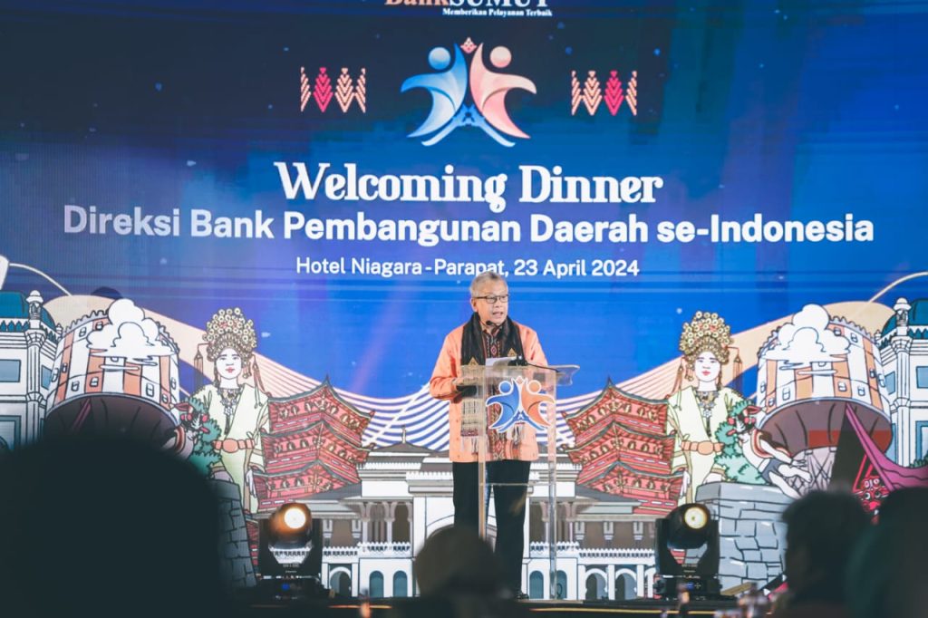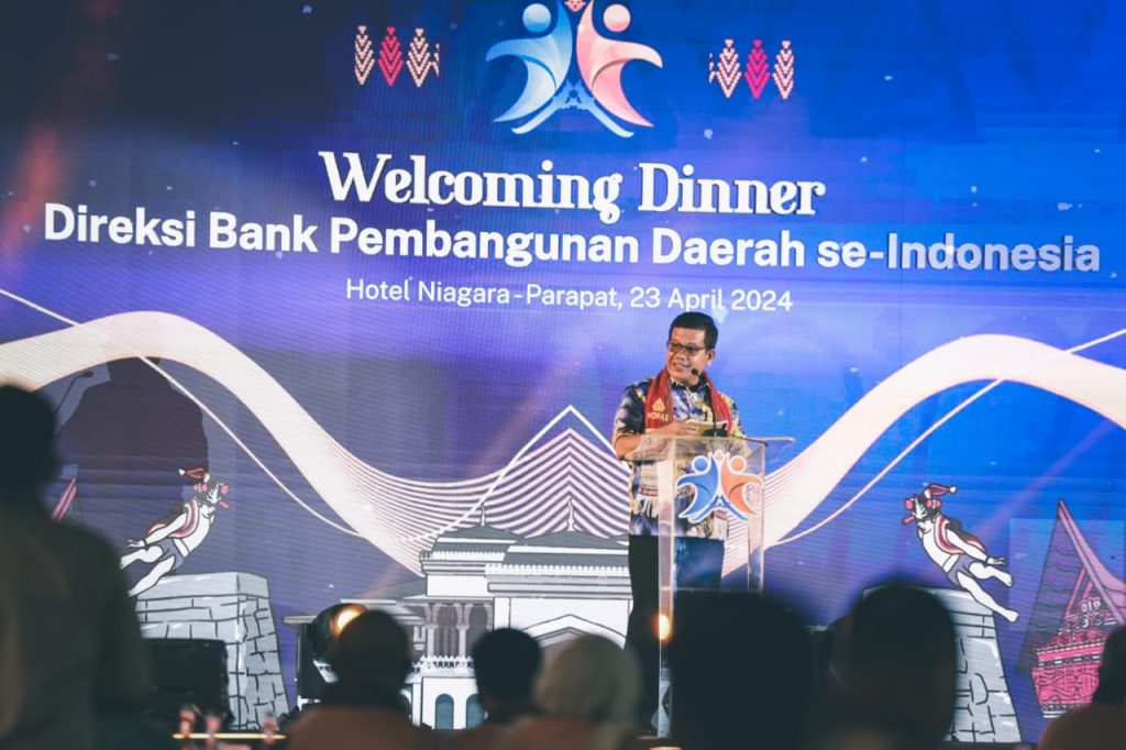Asosiasi Bank Pembangunan Daerah (Asbanda) dan Bank Sumut menyambut direksi Bank Pembangunan Daerah se-Indonesia (BPDSI) dalam Welcoming Dinner Undian Tabungan Simpeda Periode ke-2 Tahun XXXIV-2024 di Hotel Niagara Parapat, Simalungun, Sumatra Utara (Sumut), 23 April 2024.