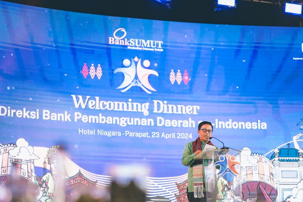 Direktur Utama Bank Sumut Babay Parid Wazdi, saat memberikan Welcome Speech kepada jajaran direksi BPDSI dalam Welcoming Dinner Undian Tabungan Simpeda Periode ke-2 Tahun XXXIV-2024 di Hotel Niagara Parapat, Simalungun, Sumatra Utara (Sumut), 23 April 2024.Ketua Umum Asbanda Yuddy Renaldi, saat memberikan sambutan kepada jajaran direksi BPDSI dalam Welcoming Dinner Undian Tabungan Simpeda Periode ke-2 Tahun XXXIV-2024 di Hotel Niagara Parapat, Simalungun, Sumatra Utara (Sumut), 23 April 2024.Bupati Simalungun Radiapoh Hasiholan Sinaga, SH, saat memberikan sambutan dan pantun kepada jajaran direksi BPDSI dalam Welcoming Dinner Undian Tabungan Simpeda Periode ke-2 Tahun XXXIV-2024 di Hotel Niagara Parapat, Simalungun, Sumatra Utara (Sumut), 23 April 2024.Novia Situmeang saat menyanyikan salah satu lagu hits sebagai penutup acara Welcoming Dinner Undian Tabungan Simpeda Periode ke-2 Tahun XXXIV-2024 di Hotel Niagara Parapat, Simalungun, Sumatra Utara (Sumut), 23 April 2024.
