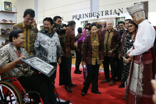 Presiden Republik Indonesia Joko Widodo didampingi Menteri BUMN RI Rini Soemarno (keempat kanan), Menteri Perdagangan RI Enggartiasto Lukita (ketiga kanan), Head of Public Relations PT Astra International Tbk Yulian Warman (ketiga kiri), Ketua Pengurus Yayasan Pendidikan Astra-Michael D. Ruslim (YPA-MDR) Herawati Prasetyo (kedua kanan) dan Sekretaris Pengurus Yayasan Dharma Bhakti Astra (YDBA) Mohammad Iqbal (kedua kiri) melihat sketsa wajah yang digambar oleh Priyo Siswoyo (kiri) salah satu binaan Astra Disability Connection Program (ADCP) pada pembukaan acara Pameran Kerajinan Nusantara Kriyanusa 2017 di Jakarta Convention Center (27/9).