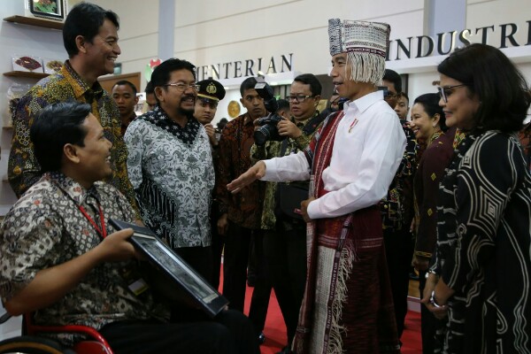 Presiden Republik Indonesia Joko Widodo didampingi Menteri BUMN RI Rini Soemarno (kedua kanan), berbincang bersama Head of Public Relations PT Astra International Tbk Yulian Warman (ketiga kiri), Ketua Pengurus Yayasan Pendidikan Astra-Michael D. Ruslim (YPA-MDR) Herawati Prasetyo (kanan), Sekretaris Pengurus Yayasan Dharma Bhakti Astra (YDBA) Mohammad Iqbal (kedua kiri) dan Priyo Siswoyo (kiri) salah satu binaan Astra Disability Connection Program (ADCP) pada pembukaan acara Pameran Kerajinan Nusantara Kriyanusa 2017 di Jakarta Convention Center (27/9).