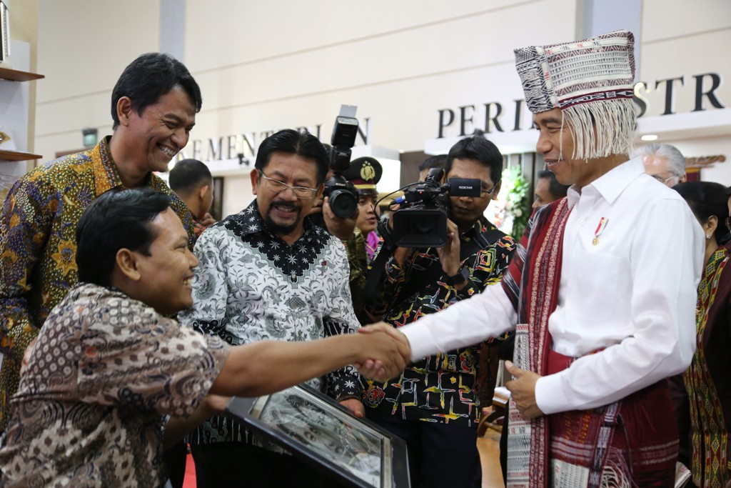Presiden Republik Indonesia Joko Widodo bersalaman dengan Priyo Siswoyo (kiri) salah satu binaan Astra Disability Connection Program (ADCP) yang didampingi Head of Public Relations PT Astra International Tbk Yulian Warman (ketiga kiri) dan Sekretaris Pengurus Yayasan Dharma Bhakti Astra (YDBA) Mohammad Iqbal (kedua kiri) pada pembukaan acara Pameran Kerajinan Nusantara Kriyanusa 2017 di Jakarta Convention Center (27/9). (*)