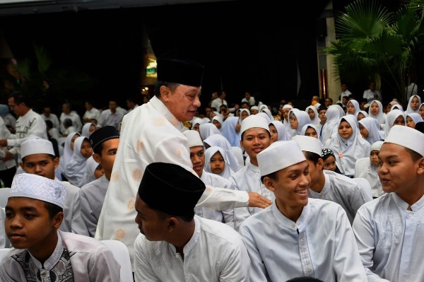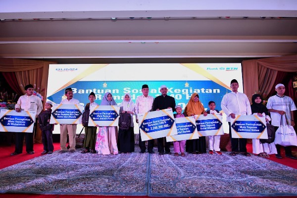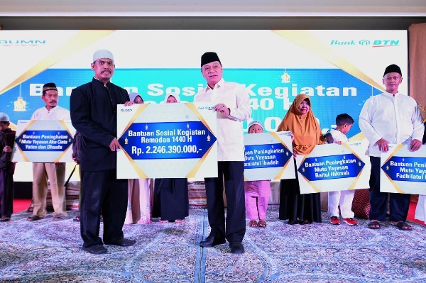Direktur Utama PT Bank Tabungan Negara (Persero) Tbk Maryono menyerahkan secara simbolis bantuan sosial kepada perwakilan dari Yayasan Al Mubarokah, salah satu dari 6 Yayasan Yatim Piatu dari Jakarta dan Banten yang disantuni Bank BTN dalam acara buka puasa bersama anak yatim di Jakarta, Senin (27/5). Selama bulan Ramadan, Bank BTN menggelar Safari Ramadan di sekitar 52 lokasi di Indonesia dan menyalurkan bantuan sosial dengan nilai lebih dari Rp 2,24 miliar. Bantuan yang disalurkan Bank BTN diberikan baik dalam bentuk dana santunan dan bingkisan sembako maupun dana bantuan perbaikan sarana ibadah dan pengembangan kualitas Yayasan Yatim Piatu dan Pondok Pesantren. (*)