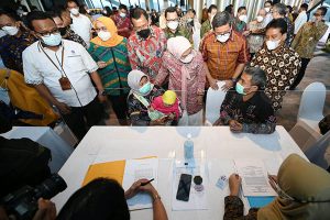 Menteri Ketenagakerjaan, Ida Fauziyah (ketiga dari kiri) menyerahkan secara simbolis kunci rumah kepada peserta akad massal kredit rumah pekerja Manfaat Layanan Tambahan (MLT) Program Jaminan Hari Tua disaksikan Direktur Utama PT Bank Tabungan Negara (Persero) Tbk Haru Koesmahargyo (kanan) dan Direktur Pengembangan dan Investasi BPJAMSOSTEK Edwin Ridwan (kiri) di Tangerang, Banten, Selasa, 30 November 2021. Menjelang HUT KPR BTN ke 45 yang jatuh pada tanggal 10 Desember mendatang, Bank BTN menggelar akad massal kredit rumah pekerja MLT Progam Jaminan Hari Tua (JHT). Kredit rumah tersebut merupakan hasil kolaborasi Kementerian Ketenagakerjaan, Bank BTN dan BPJAMSOSTEK untuk memperluas fasilitas pembiayaan kepada pada pekerja diantaranya fasilitas kredit pemilikan rumah dan renovasi rumah. Tahun ini Bank BTN menargetkan realisasi kredit MLT tersebut mencapai Rp 100 miliar hingga akhir tahun 2021.