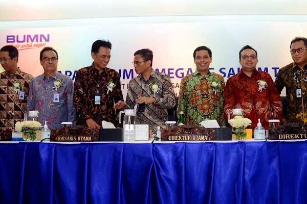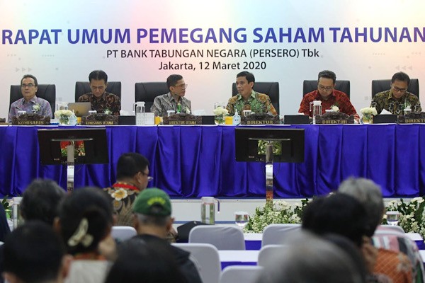 Direktur Utama PT Bank Tabungan Negara (Persero) Tbk. Pahala N. Mansury didampingi Direksi Nixon LP Napitupulu (keriga kanan), Andi Nirwoto (kedua kanan), Yossi Istanto (kanan) bersama Komisaris Utama Chandra M. Hamzah serta jajaran Komisaris Eko D. Heripoerwanto (kiri) berfoto bersama saat menggelar Rapat Umum Pemegang Saham Tahunan, di Jakarta, Kamis (12/3/2020). RUPST BTN membahas 7 agenda, diantaranya persetujuan laporan keuangan tahun 2019, penggunaan laba bersih termasuk pembagian dividen. Tahun 2020 Bank BTN akan fokus pada perbaikan kualitas bisnis dengan strategi peningkatan profitabilitas, penurunan cost of fund dan biaya umum dengan target laba akhir tahun pada kisaran Rp3 triliun. (*)