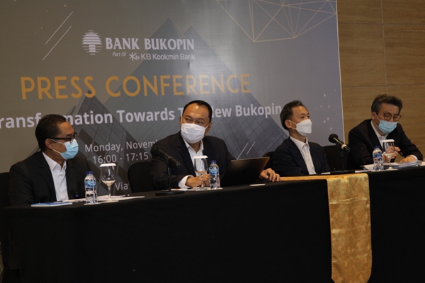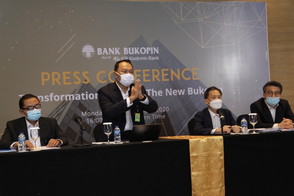 Direktur Utama Bank Bukopin Rivan A. Purwantono (kedua kiri) didampingi Chief of Operation Bank Bukopin Helmi Fahrudin (kiri), Chief Financial Officer Senghyup Sin (kedua kanan) dan Chief Strategic Officer Jikyu Jang (kanan) saat Konferensi Pers Virtual dengan Tema “Transformasi Menuju Bukopin Baru” di Jakarta, Senin 30 November 2020. PT Bank Bukopin Tbk (BBKP) terus berupaya meningkatkan pelayanan dan kepuasan nasabah dan masyarakat luas ditengah ketatnya persaingan dan besarnya efek pandemi COVID-19. Upaya ini memperoleh dukungan penuh KB Kookmin Bank sebagai Pemegang Saham Pengendali (67%) yang saat ini sedang menjalankan kebijakan transformasi di BBKP untuk memperkuat fundamental bisnis perusahaan. Kehadiran KB Kookmin Bank telah memberikan dampak positif terhadap permodalan, perbaikan proses internal dan pengawasan.