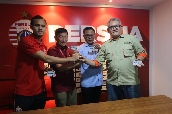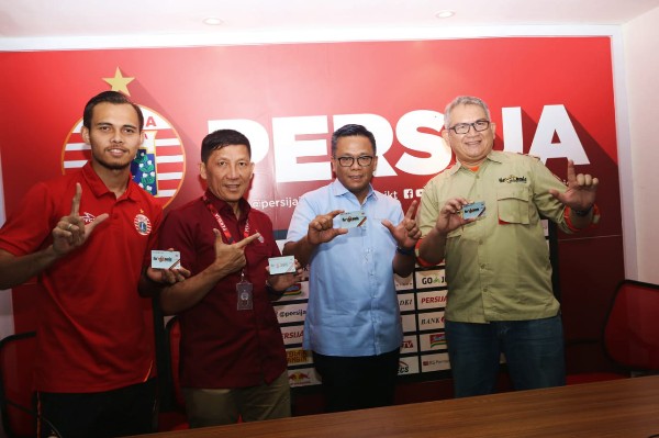 Sekretaris Perusahaan Bank DKI, Herry Djufraini (kedua kanan) menyerahkan secara simbolis JakCard edisi khusus JakMania kepada Ketua Umum JakMania, Fery Indrasjarief ( kanan) disaksikan oleh CEO Persija Jakarta, Ferry Paulus (kedua kiri) dan Pemain Persija Jakarta, Rezaldi Hehanusa (kiri) di Jakarta, (31/07). Anggota suporter JakMania dapat menggunakan JakCard pada fasilitas layanan publik seperti Transjakarta, dan transaksi pembayaran tiket untuk program regular dan personal frequent rider Kereta Bandara. Kartu JakCard juga bisa digunakan untuk melakukan transaksi pembayaran di kawasan wisata publik ibu kota, seperti Monumen Nasional (Monas), Taman Margasatwa Ragunan, dan Museum Seni & Keramik. Bank DKI kedepannya juga akan meluncurkan Jakcard edisi khusus pemain-pemain Persija kebanggaan JakMania. (*)