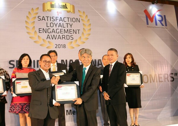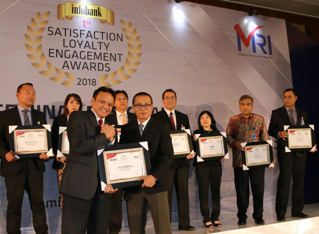 Direktur Teknologi & Informasi Bank DKI, Priagung Suprapto (kedua kanan) memperlihatkan 8 piagam pernghargaan yang dimenangkan Bank DKI bersama dengan Pemimpin Grup Pengembangan Jaringan Bank DKI, Romy Wijayanto (kanan) pada Infobank 1st Satisfaction Loyalty Engagement Awards 2018 di Jakarta (17/05). Penghargaan yang diterima Bank DKI diantaranya 2 peringkat 1 untuk Experience Index dan Satisfaction Index, 3 peringkat 2 untuk kategori Satisfaction Index (kategori Fisik, dan ATM) dan 3 peringkat 3 kategori Satisfaction Index (untuk kategori satpam, customer service dan teller) peringkat 3 pada kategori Net Promoter Scope (yang menandakan tingkat kesediaan nasabah untuk merekomendasikan Bank DKI cukup tinggi). (*)