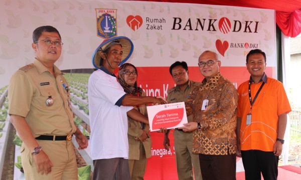 Direktur Kepatuhan Bank DKI, Budi Mulyo Utomo (ketiga dari kiri) bersama Direktur Rumah Zakat, Asep Nurdin (kedua dari kiri), Camat Pulogadung, Bambang Pangestu (paling kiri), Kepala UPRS Jatinegara Kaum, Asih Sumaretmi (paling kanan) bersama warga Rusunawa Jatinegara Kaum menunjukkan hasil budidaya Hidroponik usai peresmian kebun Hidroponik di Rusunawa Jatinegara Kaum di Jakarta, (12/12). (*)