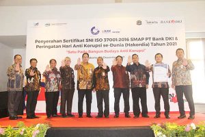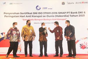Direktur Utama Bank DKI, Fidri Arnaldy (kedua dari kiri), menerima Sertifikat SNI ISO 37001:2016 Sistem Manajemen Anti Penyuapan dari Vice President Certification Tuv Nord Indonesia, Dony Moehardono (tengah) dan disaksikan oleh Kepala Otoritas Jasa Keuangan Regional 1 DKI Jakarta dan Banten, Dhani Gunawan Idat (paling kanan), Komisaris Independen merangkap Plt. Komisaris Utama PT Bank DKI, Lukman Hakim (paling kiri), dan Direktur Antikorupsi Badan Usaha Kedeputian Pencegahan dan Monitoring Komisi Pemberantasan Korupsi, Aminudin (kedua dari kanan), di Jakarta, Senin 20 Desember 2021. Proses sertifikasi yang dimulai sejak bulan Juli 2021 dan dinyatakan selesai prosesnya pada bulan November 2021 ini menjadi panduan bagi Bank DKI dalam mengimplementasikan, mengevaluasi dan melakukan peningkatan yang berkelanjutan guna mencegah dan mendeteksi penyuapan, serta memberikan manfaat berupa proses bisnis yang semakin efisien, transparan, akuntabel serta meningkatkan kepercayaan stakeholder perusahaan.