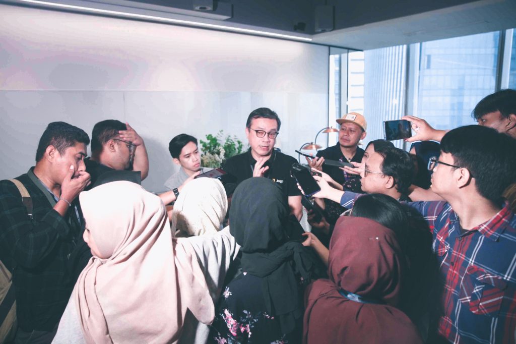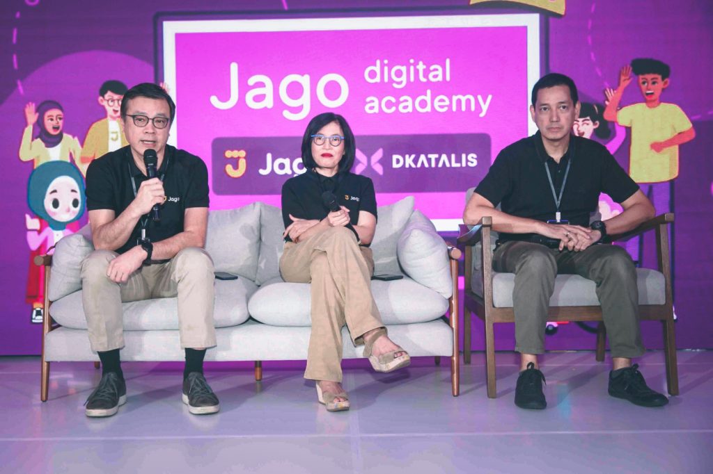 Direktur Utama Bank Jago Arief Harris Tandjung, didampingi Head of Communication Culture and Sustainability Bank Jago Maya Kartika dan CEO Dkatalis Kharim Siregar (kiri kekanan). Memberikan sambutan pada acara Peluncuran Jago Digital Academy di Jakarta, Kamis, 9 November 2023.Direktur Utama Bank Jago Arief Harris Tandjung menyempatkan diri untuk wawancara langsung dengan beberapa media selesai acara Peluncuran Jago Digital Academy di Jakarta, Kamis, 9 November 2023.
