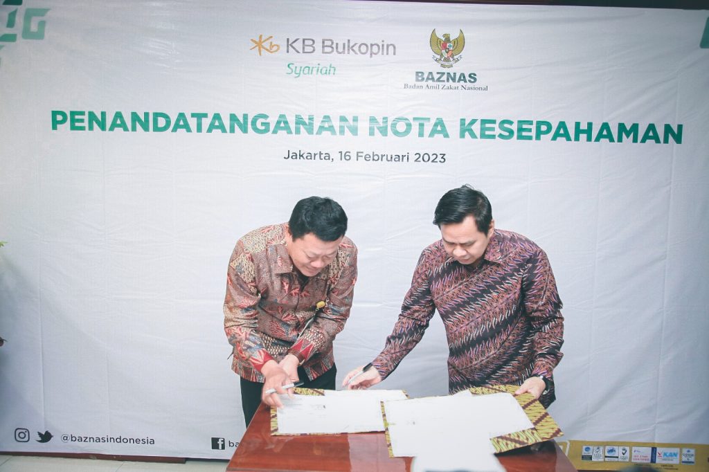 Direktur Bisnis PT Bank KB Bukopin Syariah (KBBS) Agus Suhendro (kiri) bersama dengan Pimpinan Bidang Pengumpulan BAZNAS Rizaludin Kurniawan tengah melakukan penandatanganan Nota Kesepahaman (MoU) dengan Badan Amil Zakat Nasional (BAZNAS) mengenai penguatan pengelolaan Zakat, Infak, Sedekah, DSKL dan Kurban dengan Dukungan Layanan Jasa Perbankan di Jakarta,Direktur Bisnis PT Bank KB Bukopin Syariah (KBBS) Agus Suhendro (kiri) berjabat tangan dengan Pimpinan Bidang Pengumpulan BAZNAS Rizaludin Kurniawan usai melakukan penandatanganan Nota Kesepahaman (MoU) dengan Badan Amil Zakat Nasional (BAZNAS) mengenai penguatan pengelolaan Zakat, Infak, Sedekah, DSKL dan Kurban dengan Dukungan Layanan Jasa Perbankan di Jakarta, Kamis, 16 Februari 2023.