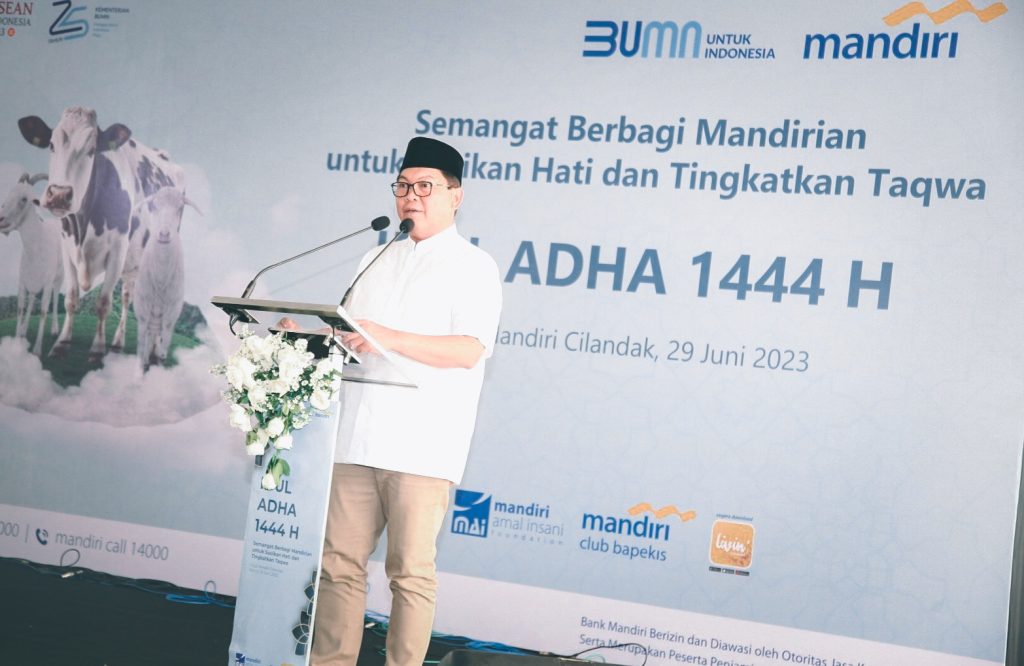 Direktur Utama Bank Mandiri Darmawan Junaidi memberikan sambutan sesaat sebelum acara pemotongan hewan kurban pada Idul Adha 1444 Hijriah di Griya Mandiri Cilandak, Jakarta.