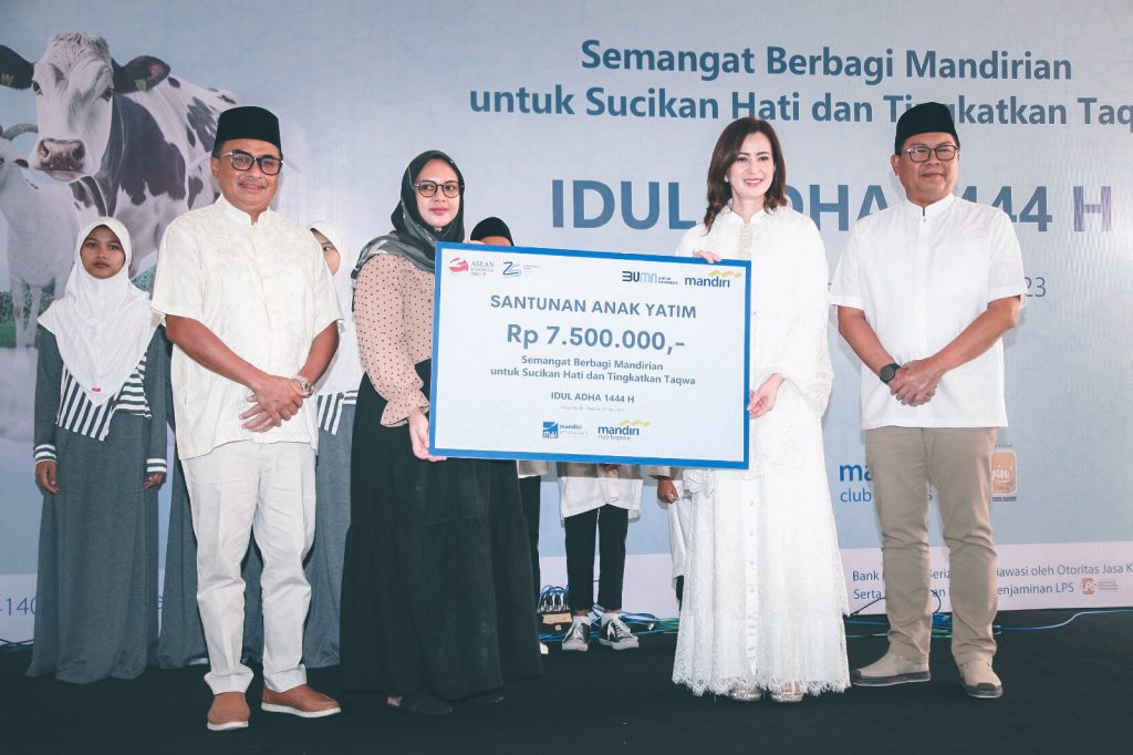 Wakil Direktur Utama Bank Mandiri, Alexandra Askandar (kedua kanan) bersama Direktur Utama Bank Mandiri Darmawan Junaidi dan Direktur Agus Dwi Handaya memberikan santunan kepada anak yatim disela acara pemotongan hewan kurban pada Idul Adha 1444 Hijriah di Griya Mandiri Cilandak, Jakarta.