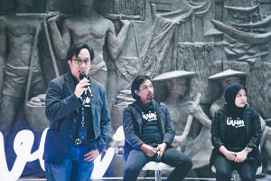 VP CSR Department Center Bank Mandiri Diwangkoro A. Ratam (kiri) tengah presentasi di headman media bersama dengan Alumni dan Juara 1 WMM 2018 Melinda Amalia (kanan) dan Juri WMM 2022 Dimas Djayadiningrat saat kick-off program Wirausaha Muda Mandiri (WMM) 2022.