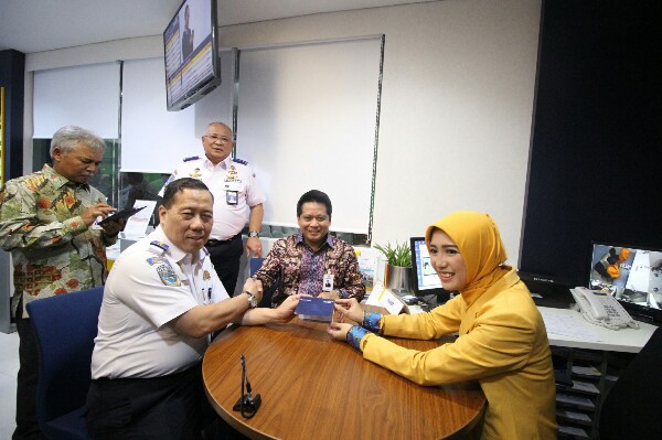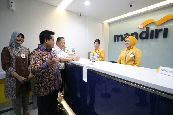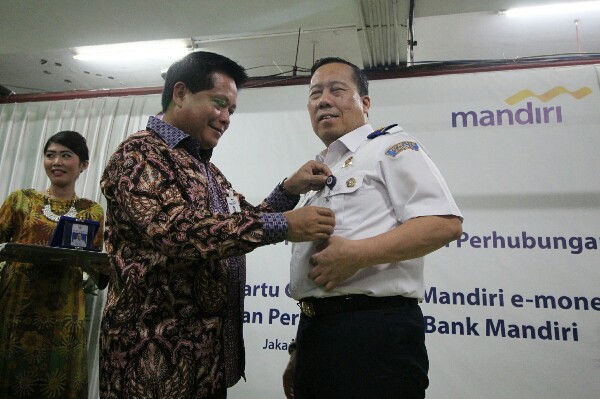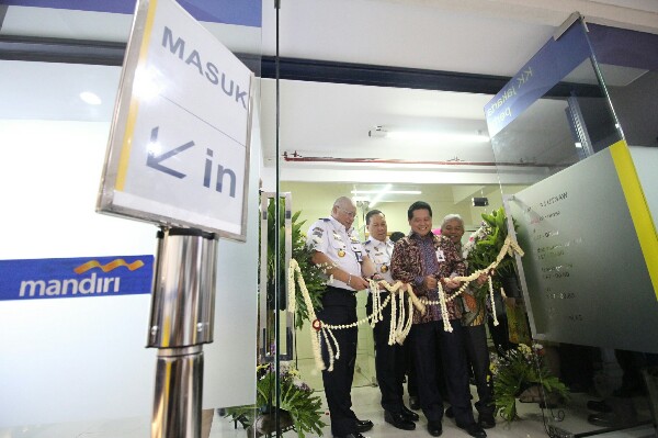 Direktur Distribution Bank Mandiri Hery Gunardi dan Sekretaris Jenderal Kementerian Perhubungan Sugihardjo tengah menyerahkan buku tabungan usai meresmikan pengoperasian kantor cabang Bank Mandiri Jakarta Kementerian Perhubungan (15/11). Bank Mandiri berkomitmen mengoptimalkan layanan keuangan dan pengoperasion kantor cabang ini akan berfungsi sebagai kepanjangan tangan perseroan untuk mendukung penuh institusi dan lembaga negara dalam melakukan tugas dan fungsinya. Secara nasional, kantor cabang ini merupakan jaringan kantor ke-2.612 di seluruh Indonesia. (*)