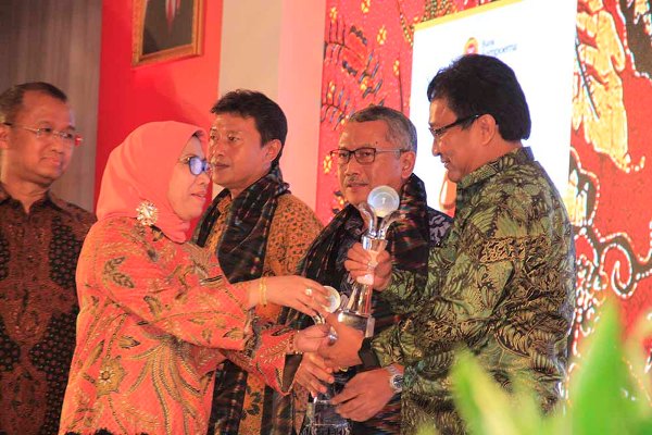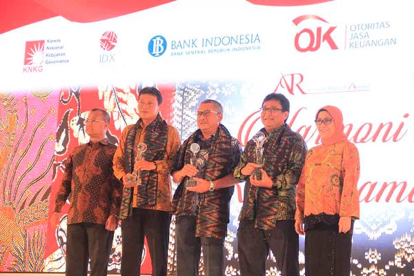 Direktur Utama Bank Mandiri Taspen Pos (Bank Mantap) Josephus K. Triprakoso (kanan) menerima Penghargaan dari Wakil Ketua Dewan Komisioner OJK, Nurhaida Sebagai Juara 1 kategori Private Keuangan Non Listed dalam acara Annual Report Award (ARA) di Kementerian Keuangan, Jakarta, Selasa Malam 19 September 2017. Untuk kualitas penerapan keterbukaan informasi pada Laporan Tahunan Bank Mantap Tahun buku 2016. (*)