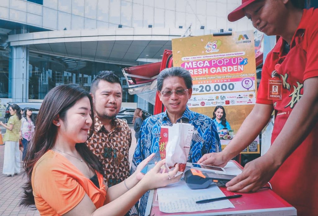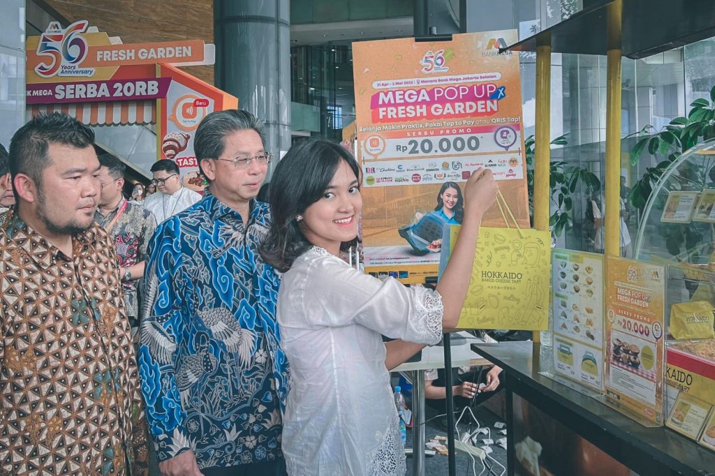 Direktur Utama Bank Mega Kostaman Thayib (tengah) didampingi oleh Credit Card & Personal Loan Marketing & Business Support Head Bank Mega Riza Zenies (kiri), menyaksikan pengunjung yang melakukan transaksi pada acara Mega Pop Up X Fresh Garden, di Jakarta, Senin 21 April 2025.Direktur Utama Bank Mega Kostaman Thayib (ketiga kiri) didampingi oleh Credit Card & Personal Loan Marketing & Business Support Head Bank Mega Riza Zenies (kedua kiri), sedang menyaksikan Konten Kreator Monica Fiolita (kiri) yang sedang bertransaksi pada event Mega Pop Up X Fresh Garden yang berlangsung pada tanggal 21 April – 2 Mei 2025 berlokasi di kawasan Menara Bank Mega, Jakarta.