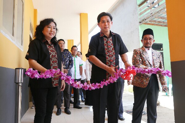 Direktur Utama Bank Mega, Kostaman Thayib (batik hitam) dan Regional Head Banjarmasin, Therecia Alfoncia Sandhora (batik hitam) bersama perwakilan nasabah dan siswa saat meresmikan SMA Ma’arif yang telah selesai pembangunannya di Ketapang – Kalimantan Barat. Pembangunan tersebut diprakarsai oleh program Mega Berbagi dimana Bank Mega bersinergi dengan Nasabah untuk membantu dunia pendidikan dengan menyisihkan minimal 1% dari suku bunga Tabungan Mega Berbagi yang diterima dan Bank Mega memberikan tambahan 1%. Sepanjang tahun 2017, Program Mega Berbagi telah membangun kembali 23 sekolah yang tersebar di Indonesia dari 34 sekolah yang direncanakan, sehingga sisanya diharapkan dapat rampung pada semester I-2018. Adapun selanjutnya pada November 2017 lalu Komite Mega Berbagi telah menetapkan 24 sekolah lagi yang akan mendapatkan bantuan renovasi di berbagai kota dan diharapkan selesai pada awal tahun 2019. Melalui program ini, Bank Mega berharap dapat mencerdaskan anak bangsa untuk Indonesia yang lebih baik. (*)