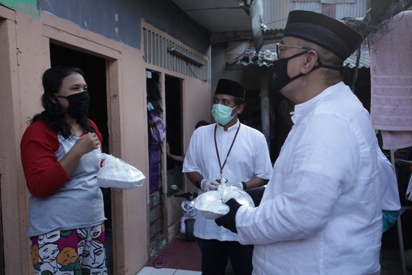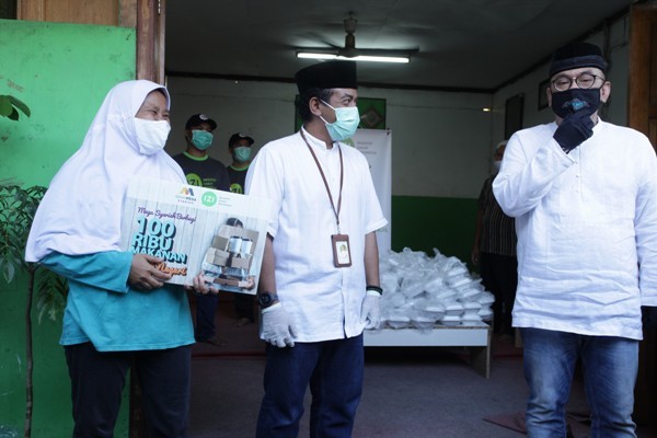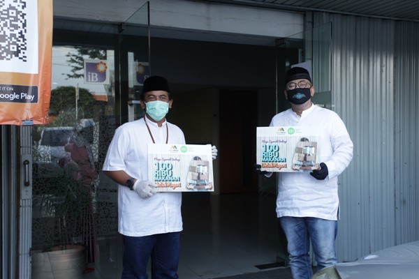 Direktur Utama Bank Mega Syariah Yuwono Waluyo (tengah) bersama Direktur Utama Insisiatif Zakat Indonesia, Wildhan Dewayana (kanan) memberikan bantuan 300 paket makanan di Rawamangun, Jakarta, Jum’at, 15 Mei 2020. Bank Mega Syariah menyalurkan bantuan berupa lebih dari 104.700 paket makanan yang dibeli dari pedagang makanan UMKM untuk masyarakat yang terdampak Pandemi COVID-19 di 40 kota seluruh Indonesia. Kegiatan bertajuk “Mega Syariah Berbagi: 100 Ribu Makanan Untuk Negeri” ini merupakan salah satu bentuk kepedulian Bank Mega Syariah sebagai bagian dari CT Corp dalam membantu melawan pandemi COVID-19 di Indonesia. Paket makanan ini diharapkan dapat membantu meringankan beban masyarakat yang terdampak COVID-19.
