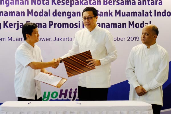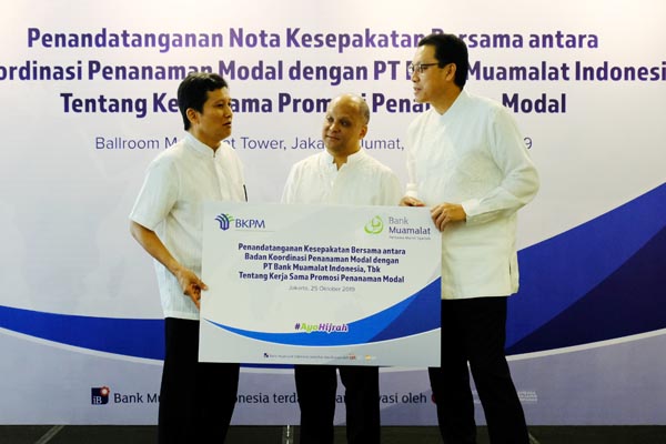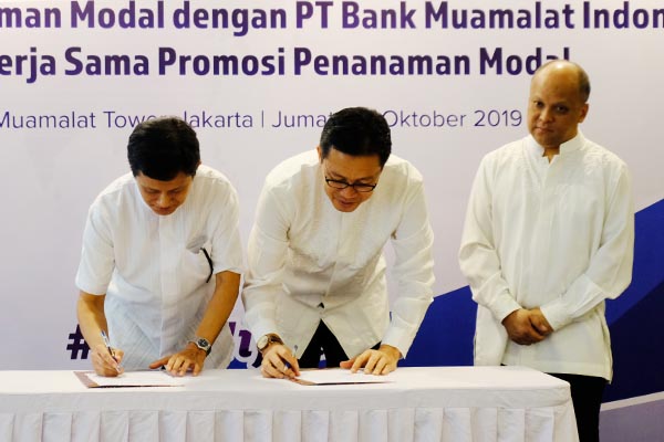Direktur Utama Bank Muamalat Achmad K. Permana bersama Komisaris Utama Bank Muamalat Ilham Akbar Habibie dan Deputi Kepala Bidang Kerjasama Penanaman Modal BKPM Wisnu Wijaya Soedibjo (kanan ke kiri) saat penandatanganan kerja sama di Jakarta, Jumat 25 Oktober 2019. PT Bank Muamalat Indonesia Tbk. bekerja sama dengan Badan Koordinasi Penanaman Modal (BKPM) dalam rangka membuka peluang bisnis dengan investor luar negeri. Tujuan dari kerja sama ini adalah untuk meningkatkan penanaman modal dan promosi hubungan ekonomi antara Indonesia dan negara lain, khususnya dengan Malaysia yang memiliki full branch. Bank Muamalat merupakan bank syariah rekanan pertama negara melalui BKPM.