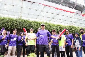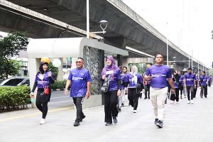 Direktur Utama PT Bank Muamalat Indonesia Tbk Achmad K. Permana (tengah bertopi putih) bersama ratusan karyawan dan nasabah terpilih, berlari saat acara Merdeka Fun Walk 2022 di Jakarta, Minggu, 21 Agustus 2022. Merdeka Fun Walk dalam rangka memperingati HUT Kemerdekaan RI ke-77 dengan rute Muamalat Tower-Jalan Sudirman. Diharapkan kegiatan ini dapat memupuk rasa nasionalisme sekaligus menjadi ajang silaturahmi antara karyawan dan manajemen.