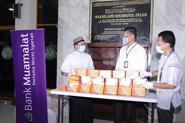 Head of Distribution & Network Bank Muamalat Agung Prambudi (tengah) didampingi Kadiv Pendistribusian & Pendayagunaan BMM Jahidin menyerahkan bantuan kepada Ketua Yayasan Masjid Roudhatul Falah Ust. Ahmad Sofwan melalui “Program Jumat Berkah di Jakarta, Jumat, 5 Februari2021. PT Bank Muamalat Indonesia Tbk berkolaborasi dengan Laznas Baitulmaal Muamalat (BMM) menyalurkan bantuan sosial kepada masyarakat Indonesia yang terdampak pandemi Covid-19 dan korban bencana alam melalui “Program Jumat Berkah”. Kegiatan ini merupakan wujud dari kepedulian sosial dan upaya perusahaan dalam membantu meringankan beban masyarakat yang terkena musibah.