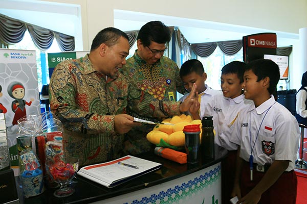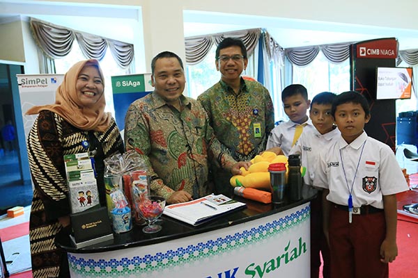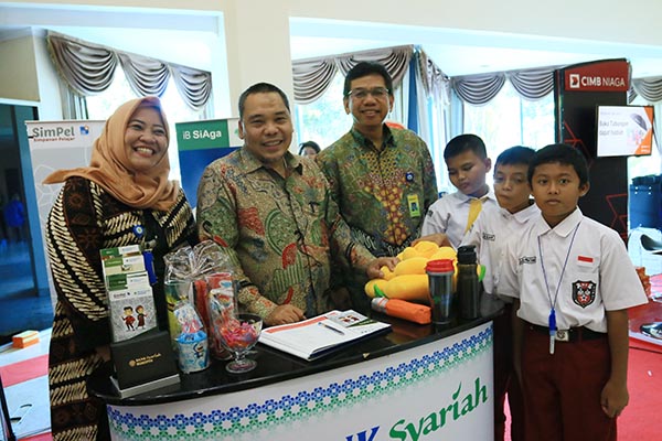 Direktur Utama PT Bank Bukopin Tbk. Eko Gindo (kiri) meninjau dan berbincang dengan pelajar di stan Bank Syariah Bukopin didampingi Direktur Kepatuhan dan Manajemen Risiko Bank Syariah Bukopin Adil Syahputera (kiri kedua) dalam acara SimPel Day dengan tema Aksi Pelajar Indonesia Menabung yang dilakukan di Jakarta, Kamis 2 Mei 2019. Dalam acara ini diumumkan Bank Syariah Bukopin sebagai bank 3 besar dalam pencapaian tabungan Simpel/IB Simpel hingga April 2019. Program ini salah satunya yaitu awareness masyarakat industri keuangan perbankan dalam menanamkan budaya menabung sejak dini dan sebagai rangkaian kegiatan menyambut Hari Indonesia Menabung.
