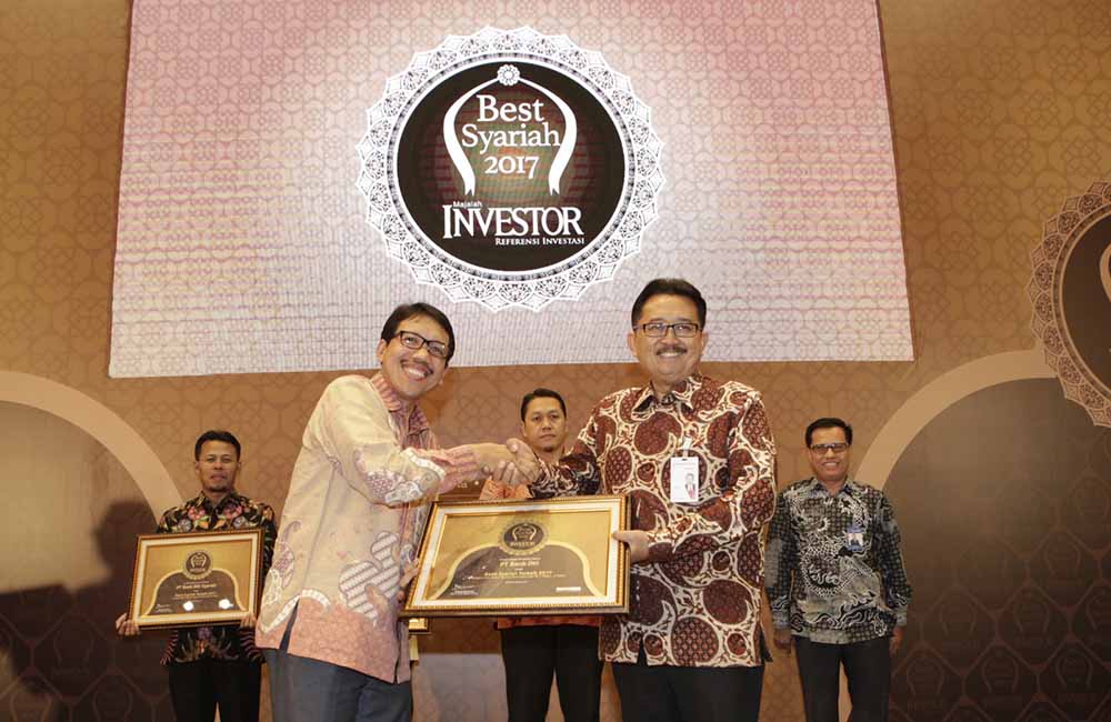 Direktur Bisnis Bank DKI, Antonius Widodo Mulyono (kanan) bersama Kepala Departemen Ekonomi Syariah Bank Indonesia, Anwar Basori (kiri) menerima penghargaan Unit Usaha Syariah (UUS) Bank DKI sebagai“Bank Syariah Terbaik 2017” kategori Unit Usaha Syariah Aset Lebih Dari Rp 1 triliun – 5 triliun dari majalah Investor di Jakarta,Selasa 22 Agustus 2017. UUS Bank DKI saat ini telah mempunyai 22 kantor layanan yang tersebar di seluruh Jadetabek dan Bandung. Layanan Syariah juga bisa dilakukan di seluruh kantor Bank DKI Konvensional di Jabodetabek.