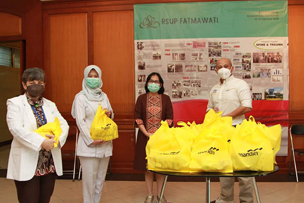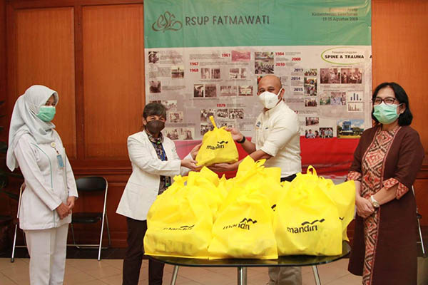 Area Head Bank Mandiri Jakarta Fatmawati Ganjar E. Suganda (kanan) dan Plh. Direktur Utama RSUP Fatmawati Loli Simanjuntak saat serah terima bantuan paket vitamin dan nutrisi bagi nakes Covid-19 yang bertugas di Gedung Induk RS Fatmawati, Jakarta, Jumat, 9 Juli 2021. Mendukung upaya menekan dan mencegah penyebaran Covid-19, Bank Mandiri berinisiatif memberikan bantuan sebanyak 15.000 paket vitamin dan nutrisi bagi para tenaga kesehatan (nakes) covid-19 yang akan didistribusikan secara bertahap di beberapa rumah sakit rujukan Covid-19 di Pulau Jawa dan Bali, termasuk di RS Fatmawati dengan jumlah 1.000 paket. Penyaluran dilakukan dengan melibatkan perwakilan Bank Mandiri di kantor yang terdekat dengan RS penerima dengan tetap menjaga protokol kesehatan.