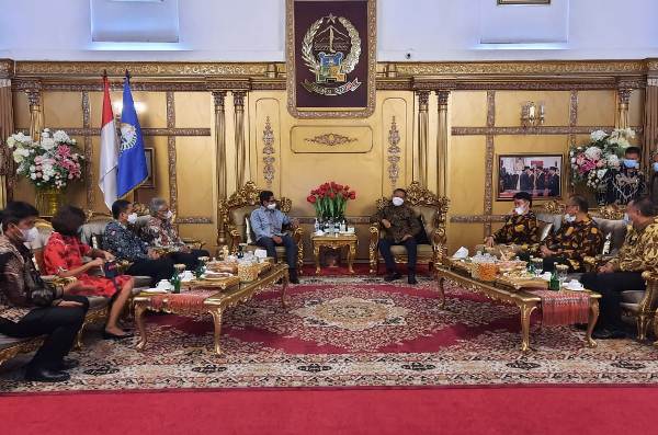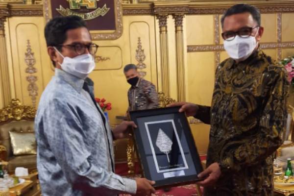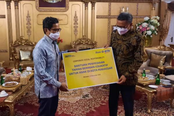 Direktur Utama BTN Pahala Nugraha Mansury (kiri) menyerahkan bantuan CSR untuk kegiatan taman bermain edukatif kepada Gubernur Sulawesi Selatan Nurdin Abdullah saat berkunjung ke kantor gubernur Sulawesi Selatan bersama Direksi BTN lainnya di Makassar, Sulawesi Selatan, Jumat 20 November 2020. PT Bank Tabungan Negara (Persero) Tbk turut aktif dalam membangun daya kembang dan kreativitas anak melalui penyediaan taman bermain yang layak untuk mereka. Melalui Bunda Paud provinsi Sulawesi Selatan, Bank BTN memberikan bantuan CSR untuk pembangunan taman edukatif anak-anak bermain di kota Makassar.