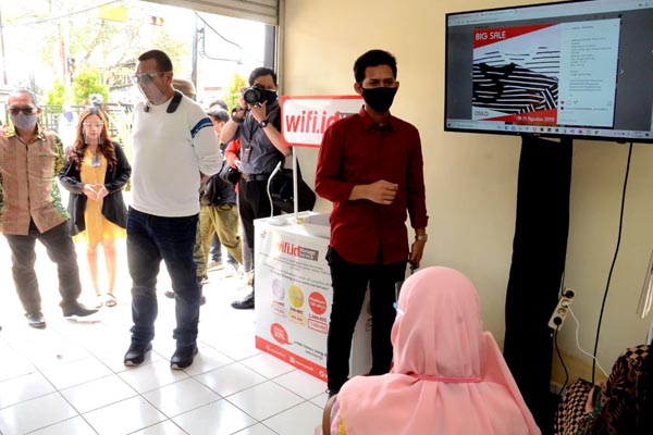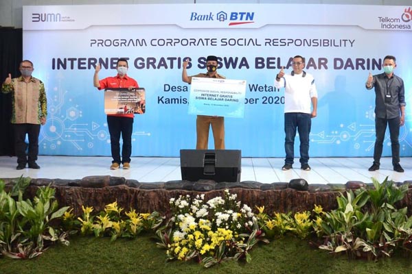 Kepala Kantor Wilayah 1 Bank BTN Manahan Hutapea, Operasional Senior Manager Marketing Telkom Regional 3 Jawa Barat Hendrawan, Kepala Desa Rancaekek Tata Darta, Staff Khusus III KBUMN Arya Sinulingga, Corporate Secretary BTN Ari Kurniaman dan Kepala Cabang BTN Bandung Bambang Prasetyo (kiri ke kanan) berfoto bersama usai penyerahan bantuan internet gratis siswa belajar daring yang di gagas oleh Bank BTN dengan Telkom, di Rancaekek, Bandung, Kamis 12 November 2020. Internet gratis tersebut merupakan kegiatan CSR Bank BTN bekerjasama dengan Telkom untuk mendukung program pemerintah terkait dengan proses belajar siswa secara daring yang diberikan kepada 30 desa di wilayah Jawa Barat. Kegiatan ini sebagai pilot project yang akan dilaksanakan oleh Bank BTN ke kantor wilayah di seluruh Indonesia.