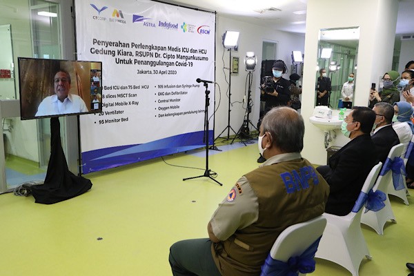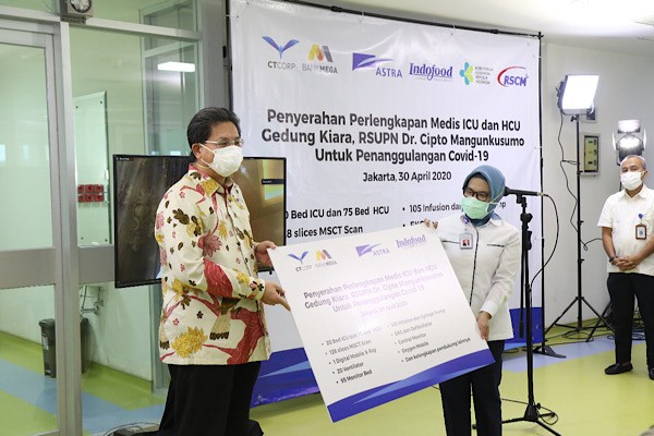 CT Corp bersama Bank Mega, didukung oleh Astra dan Indofood menyerahkan perlengkapan medis ICU dan HCU Gedung Kiara, RSUPN dr. Cipto Mangunkusumo untuk penanggulangan COVID-19. Penyerahan tersebut dilakukan secara simbolis oleh Direktur Utama Bank Mega Kostaman Thayib (kedua kanan), Direktur Indofood Franciscus Welirang (paling kanan) dan GM Head of Corporate Communications Astra Boy Kelana Soebroto (paling kiri) kepada Direktur Utama RSCM Lies Dina Liastuti di Jakarta, Kamis (30/4/2020). Acara tersebut juga dihadiri oleh Chairman CT Corp dan Komisaris Utama Bank Mega Chairul Tanjung melalui video conference.