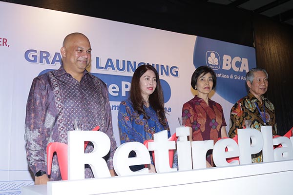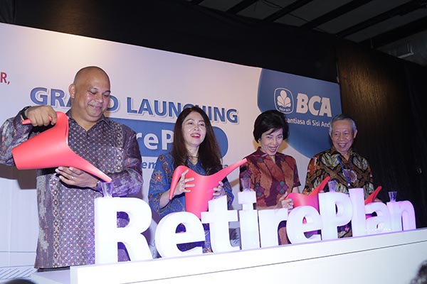 Wakil Presiden Direktur BCA Suwignyo Budiman (kanan) bersama Senior Executive Vice President Wealth Management BCA Christine Setyabudhi (dua kanan), Chief of BCA AIA Partnership Phung Magdalena (dua kiri) dan Presiden Direktur PT AIA Financial Sainthan Satyamoorthy (kiri) secara simbolis meluncurkan asuransi Proteksi Retirement Maksima (RetirePlan) sebagai solusi persiapan dana pensiun di Jakarta, Rabu 30 Oktober 2019. RetirePlan merupakan asuransi jiwa tradisional dengan pilihan bayar 5, 10, 15, atau 20 tahun yang memberikan jaminan manfaat tahunan selama 15, 20, 25, atau 30 tahun. Manfaat tahunan dijamin hingga 130% Premi Tahunan dan manfaat akhir Polis dijamin hingga 500% Premi Tahunan.