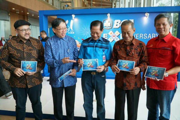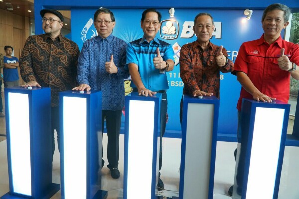 Presiden Direktur PT Bank Central Asia Tbk (BCA) Jahja Setiaatmaja (tengah) berbincang dengan CEO The Good Depts Anton Wiriono (kiri), Presiden Direktur Sinarmas Land Ridwan Darmali (kedua kiri), Presiden Komisaris BCA DE Setijoso dan Ketua Panitia BCA Expoversary Petrus Karim (kanan) usai membuka pameran BCA Expo 2018 di ICE BSD Tangerang Selatan, Jumat 9 Februari 2018. Memperingati HUT ke-61, PT BCA menghadirkan BCA Expo 2018 selama pameran, BCA menawarkan kepada nasabah antara lain kredit perumahan rakyat (KPR) dan Kredit Kendaraan Bermotor (KKB) dengan bunga ringan serta produk perbankan BCA lainnya. (*)