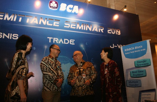 Executive Vice President International Banking BCA Edmund Tondobala (kedua kanan) didampingi Senior Vice President International Banking BCA Tjoe Henny (kiri) dan Senior Vice President Financial Institution BCA Fanny Surjadi (kanan) bersama Asisten Direktur Departemen Pengembangan Pasar Keuangan Bank Indonesia (BI) Indra Gunawan Sutarto (kedua kiri) di tengah acara Remittance Seminar 2019 di Jakarta, Selasa (26/02). BCA berkomitmen memberikan kemudahan dan kenyamanan terhadap transaksi valuta asing (valas) dan pengiriman uang berdenominasi rupiah terhadap mata uang asing atau sebaliknya. Melalui sejumlah fasilitas layanan yang disediakan KlikBCA Bisnis, nasabah melakukan transaksi valas secara online atau pengiriman valas antarnegara yang dapat langsung diterima pada hari yang sama. (*)
